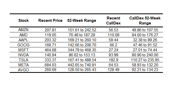 Looking at CallDex, only TSLA and AVGO are in the top half of their recent ranges. AVGO stock price is near the top of its recent range and AVGO CallDex is near the top of its recent range. That makes AVGO a great candidate for a covered call.