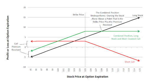 Below you can see the payoff profiles for stock you own from $100 a share (in black), a covered call with a strike price of $105 that you were able to sell at $3 (in red), and the combined position (in green).