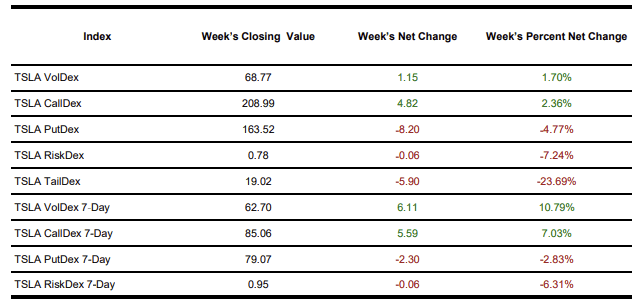 TSLA VolDex and CallDex rose slightly as you can see but put prices fell with TailDex dropping 23.69% as fear evaporated.