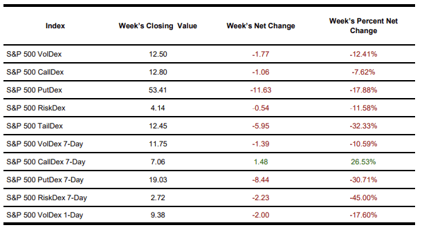 • S&P 500 out-of-the-money puts fell even more; PutDex and TailDex fell by 17.88% and 32.33% respectively