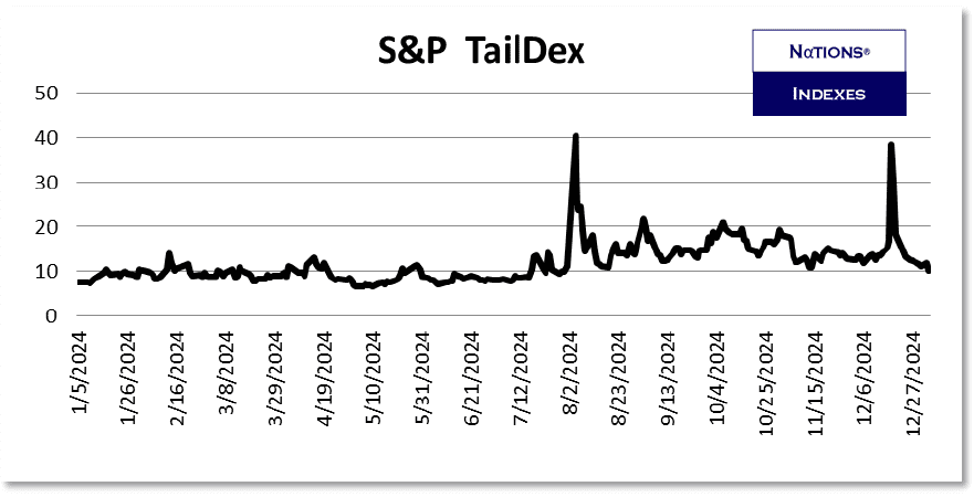 • Divergence between at-the-money volatility described by VOLI and deep out-of-the-money puts as described by TDEX is largely a function of TDEX continuing to revert to the mean following the spike to 38.43 on December 18. This divergence also indicates a lack of concern about a “tail event” in the near future