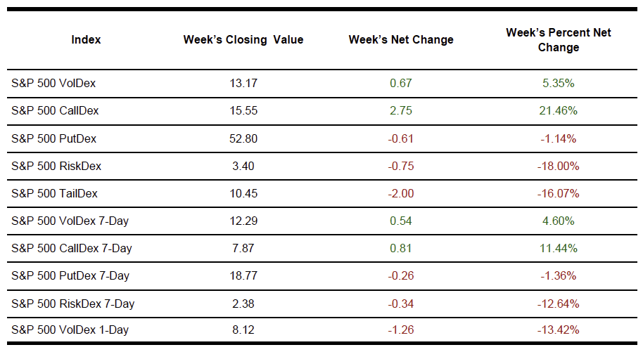 Why It Matters… Investors were feeling more confident during the week despite disappointing price action Monday through Thursday. Thus, they were willing to sell out-of-the-money put op-tions. RiskDex, which is the ratio of PutDex to CallDex fell back below 4.00 which reinforces the idea that investors are less fearful.