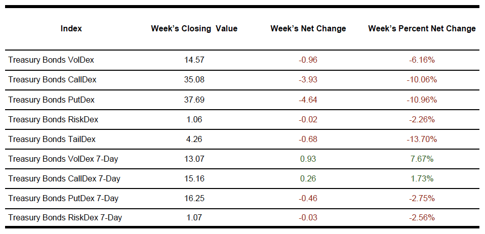 Other equity index options showed price action similar to that for the S&P with important differences. In the Nasdaq-100, option prices generally fell with TailDex falling 23.67% after last week’s decline of 23.52% but CallDex rose by 7.12%.