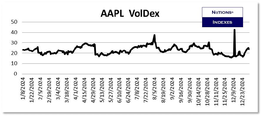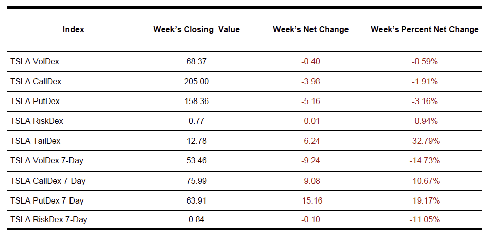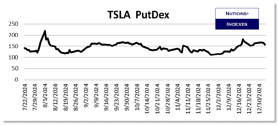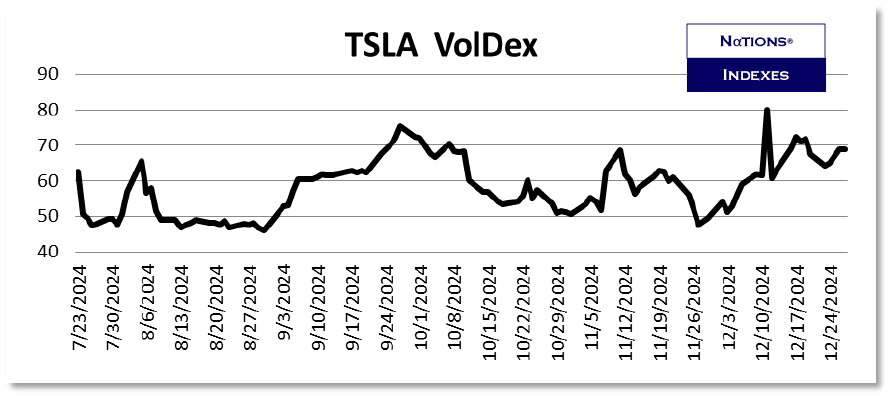 TSLA fell by 4.92% for the week to close at $410.44. It is now 15.20% below the 52-week high made on December 17. However, it is still significantly above the $275 level which was the high of TSLA’s range in 2024 until election day. Every TSLA option price metric fell for the week, despite the decline in share price, because the delivery data was released and that potential cata-lyst had passed. Note VolDex on TSLA since the middle of July.