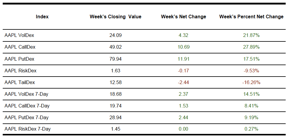 Option prices in AAPL highlight the week’s tendency for out-of-the-money put prices to decline with VolDex rising 21.87% but TailDex falling 16.26%.