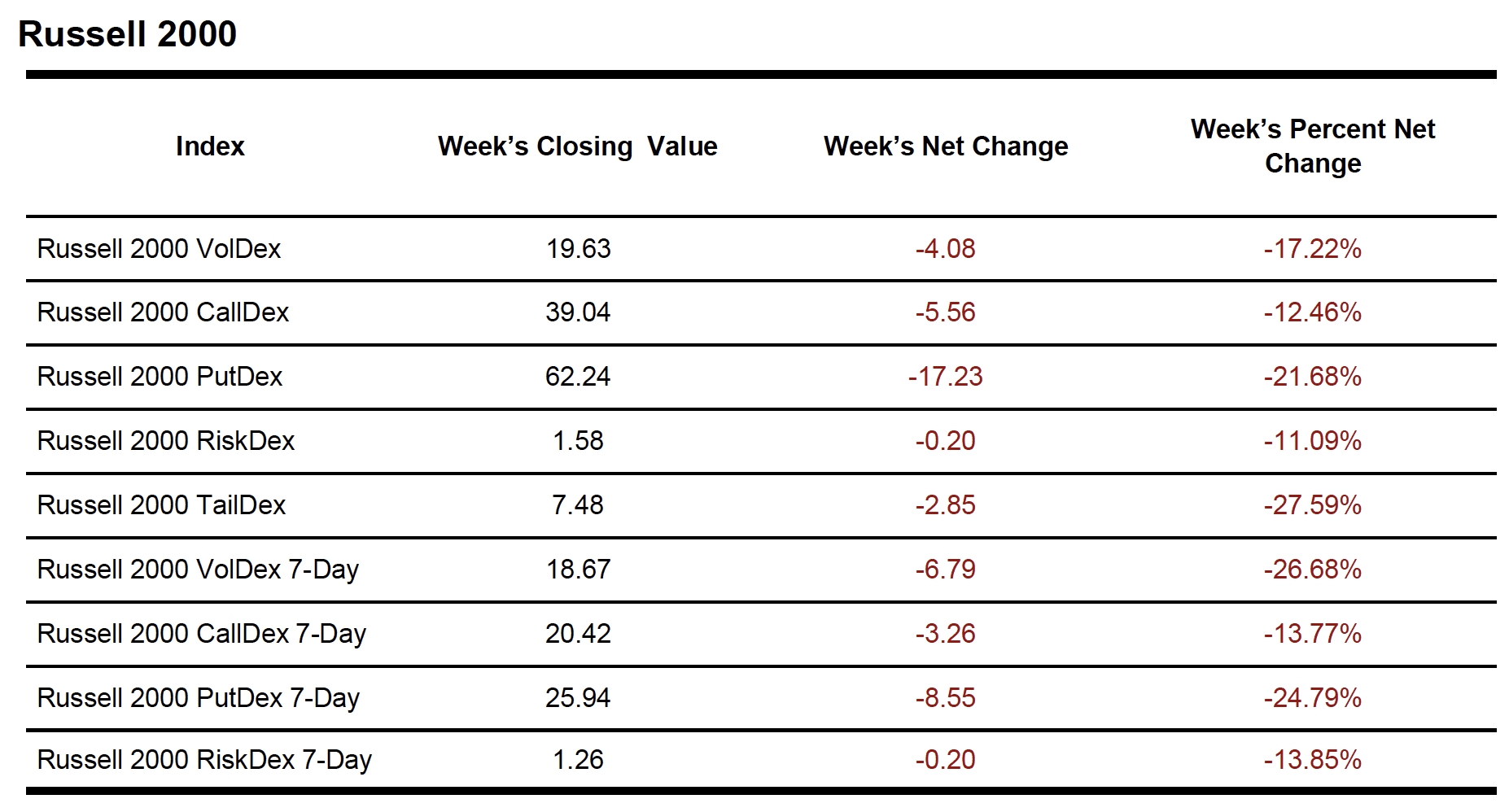 Tech names have been the big winners of the past 52 weeks and implied volatility on the Nasdaq-100 index was generally lower, mimicking that of the S&P 500, but it fell less than implied volatility in the S&P. Nasdaq-100 VolDex fell by 17.00% for the week and Nasdaq-100 TailDex fell by just 7.91%.