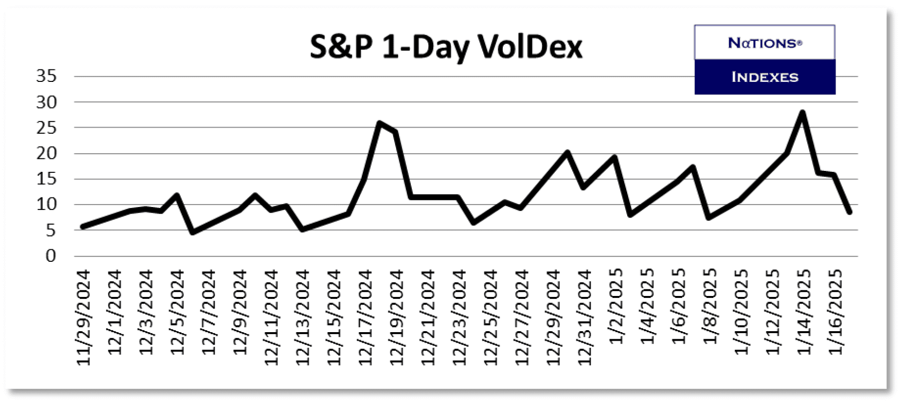 At Friday’s closing level of 14.81, VolDex on treasury bonds describes options that appear to be fairly priced given the amount of volatility realized this week and the prospect for future volatility as the Federal Reserve’s thinking regarding future rate cuts comes into focus.