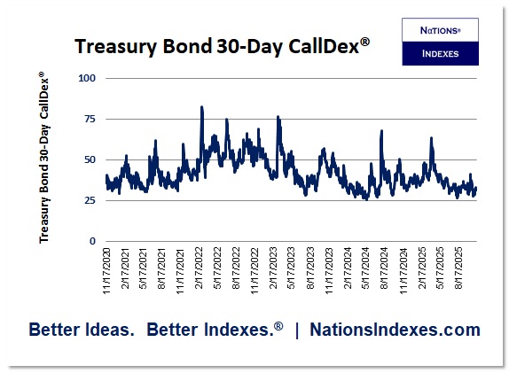 Why It Matters…We still believe the ability to buy at-the-money Treasury bond options at historically low prices is a unique opportunity given the risks currently present. While Treasury bond RiskDex is in the lower half of its 52-week range, CallDex is at just the 14th percentile, up from the 4th percentile two weeks ago. Long Treasury bond call options can be a cheap hedge for an equity portfolio since bond prices tend to rally in the face of a significant decline in equity prices.